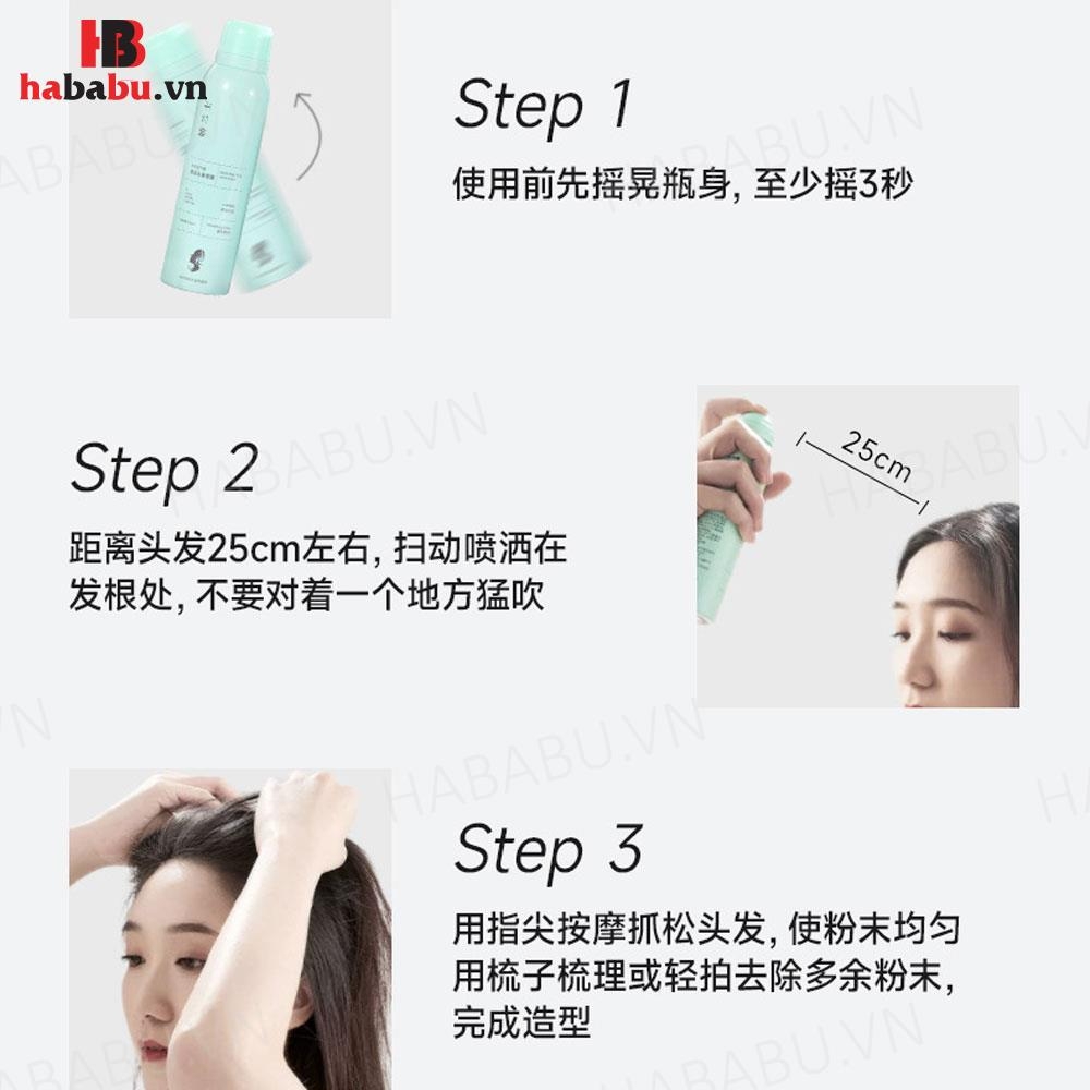 - Chỉ cần xịt một lượng nhỏ lên mái tóc là có thể làm sạch. Tránh trường hợp xịt quá nhiều, vừa gây lãng phí vừa mất thẩm mỹ cho mái tóc, làm mái tóc cứng và khô hơn bạn nghĩ.
