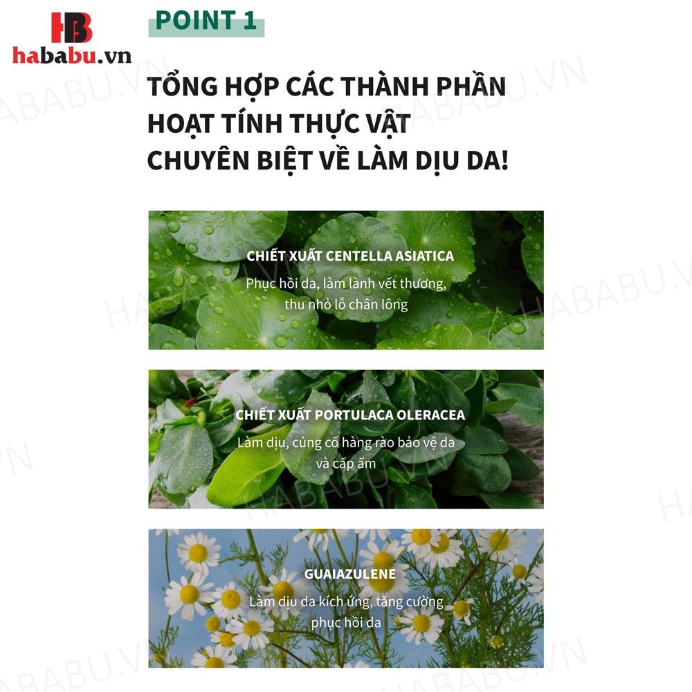 - Thành phần: chiết xuất Centella Asiatica, Portulaca Oleracea, Guaiazulene, Panthenol…