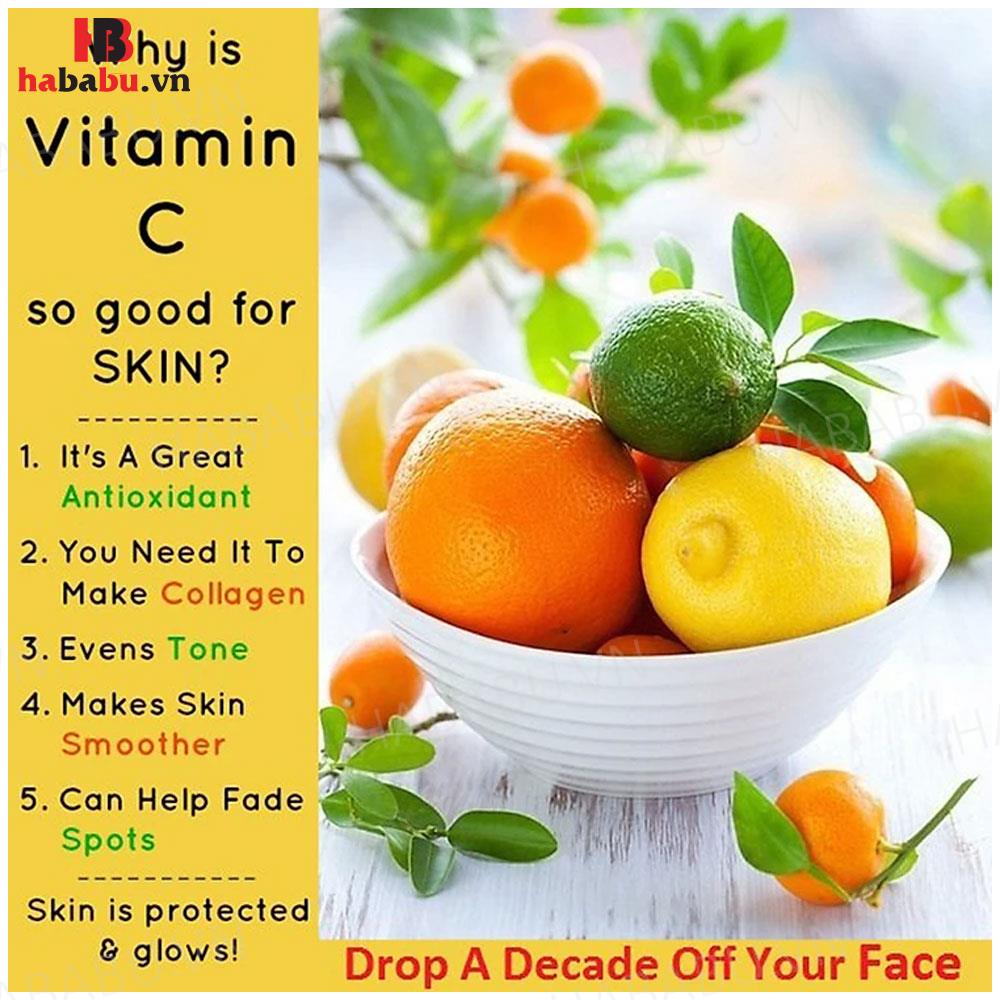 - Đặc điểm: kích thích sản xuất Collagen, chống oxy hóa làn da, giúp làn da trở nên căng mượt và sáng bóng. Làm mờ các vết thâm mụn dù là mới hay lâu năm. Giúp bật tone da trắng hơn, đồng đều màu da.